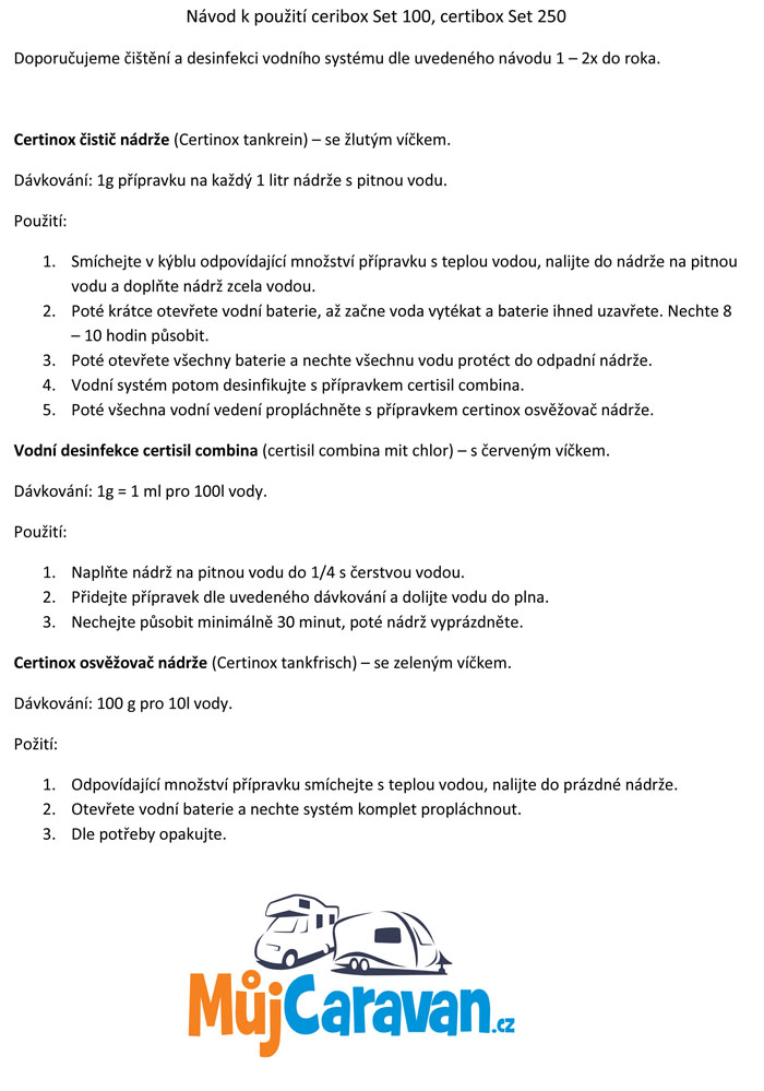 Poskládali jsme pro Vás Certibox, kompletní sadu pro čištění a desinfekci pitné vody, nádrže a vedení. Certinox k čištění a certisil k desinfekci jsou vzájemně sladěny a jsou vhodné pro velikosti nádrží do 100 l.