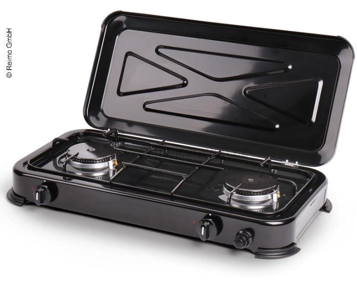 Elegantní černý plynový vařič luxusní třídy. Velikost hořáku 2x 10 cm, výkon 2x 2,2 kW.