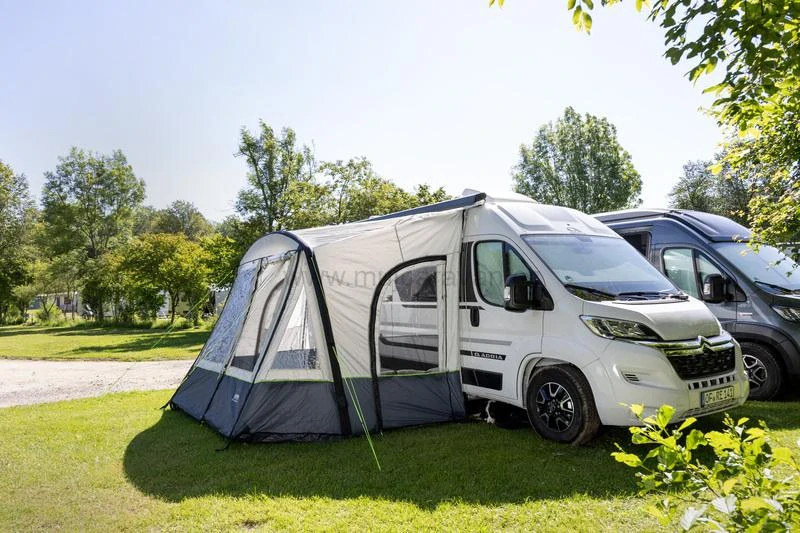 Nafukovací předstan k obytnému vozu s novou vzduchovou technologií, je potřeba pouze 1 vzduchová hadice. S vnějším ventilem, bočními stěnami s dveřmi a okny se závěsy pro maximální soukromí.