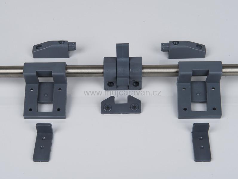 Horní dvě koncovky na obrázku se 2 otvory jsou koncovky pro připevnění kolejnice ke stěně. Jsou připevněny k oběma koncům kolejnice (stříbrná kulatá trubka) a přišroubovány ke stěně. Středový díl, který je vidět uprostřed kolejnice, slouží také k upevnění na stěnu pomocí 2 šroubů. Kolejnici (kulatou trubku) lze zkrátit dle potřeby. Středový díl dále slouží k tomu, aby byla deska stolu později zajištěna ve fixní poloze a nebylo možné ji posunout. K tomu je malá destička připevněna k desce stolu pod středovým dílem. Páčka uprostřed středového dílu slouží k uvolnění zámku.