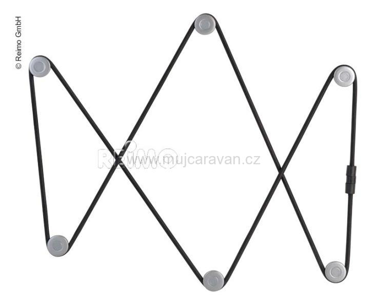 K našroubování na dveře nebo stěnu. Sada skládající se z 2 m kulaté šňůry, upevňovacích knoflíků se šroubovacími krytkami a spojky.