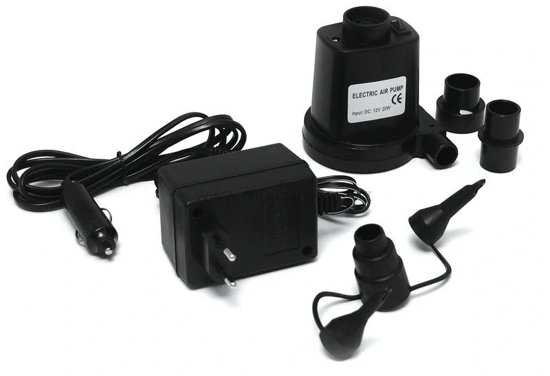 Výkonná elektrická vzduchová pumpa s 12 voltovou zástrčkou pro auto a transformátorem 230 V pro domácí zásuvku. Se 3 univerzálními konektory pro různé lůžka, křesla nebo matrace.