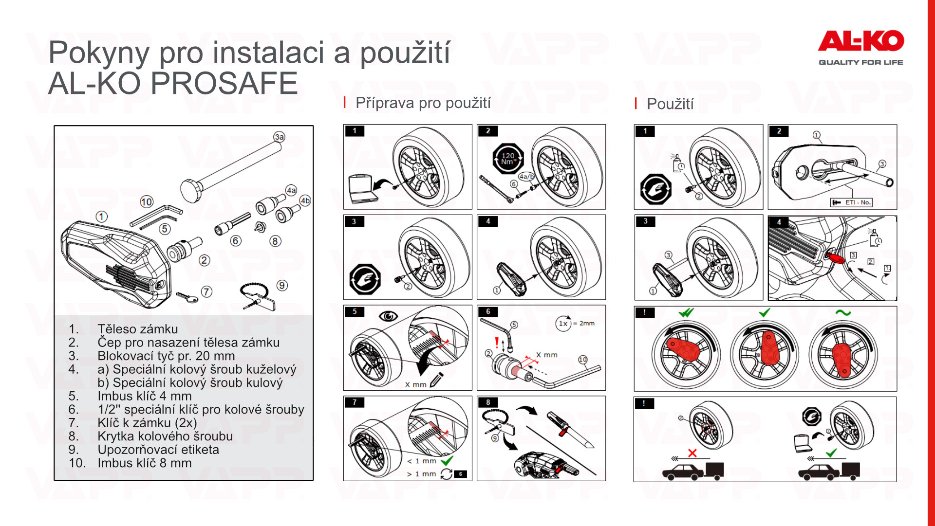 Zámek AL-KO Prosafe pro přívěsy a karavany slouží k uzamčení kola přívěsu, respektive jeho zablokování proti otáčení a znemožnění jízdy s přívěsem. Zámek se osazuje na čep speciálního kolového šroubu a svým robustním tělem kryje i ostatní kolové šrouby tak, že kolo nelze demontovat.