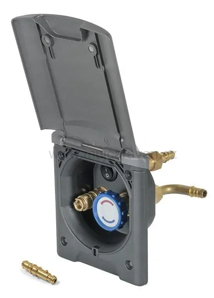 Venkovní sprcha s odklápěcím víkem, úhlovou a rovnou hadicovou hubicí a vsuvkou pro připojení sprchové hadice. Teplota vody se ovládá pomocí otočného ovladače.