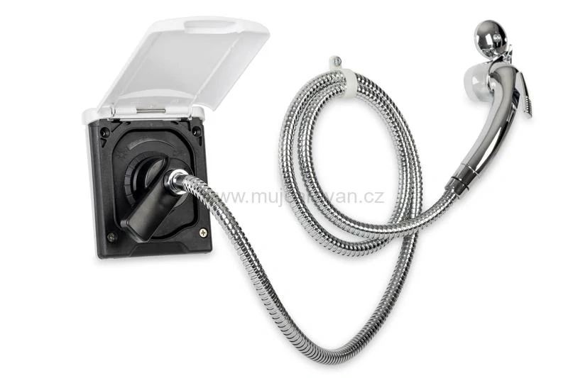 Vodní zásuvka včetně sprchy + háčku. S integrovaným směšovačem pro teplou a studenou vodu. Teplota vody je nastavitelná otáčením regulátoru teploty.