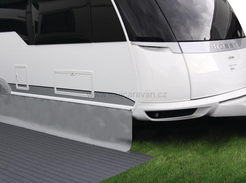 Vozidlová clona z kvalitního nepromokavého materiálu. Asi o 30 % pevnější než obvykle. Spodní plastová oka navařená ve vzdálenosti 50 cm, barva světle šedá.