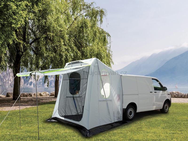 Vrchol nově vyvinutého zadního stanu UPGRADE DOME PREMIUM: Křídlové dveře lze zavřít i když je stan postaven. Kopulovitá střecha poskytuje velkorysý pocit prostoru a zároveň zabraňuje vodním kapsám při dešti a rám z ocelových trubek ve tvaru U slibuje stabilitu. Přední stěna má velké dveře (lze použít jako markýzu) a průhledné okno s vnitřním krytem a přídavnou moskytiérou. Boční stěny s oválnými okny a světlíkové okno ve střeše zajišťují dobrý výhled do všech stran. Stan doplňuje zemní plachta s integrovanou ochranou proti větru pod nárazníkem, která je upevněna suchým zipem.